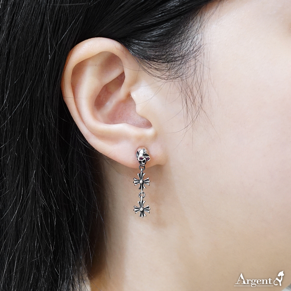 垂吊骷髏純銀耳環推薦,不對稱十字架,925銀飾,視覺系純銀耳環推薦,快戴上帶給你另類視覺效果的耳環吧-Argent安爵銀飾
